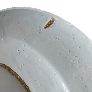 The pots were stacked in saggars within the kiln to protect them from flames and smoke during the firing process. The items were separated in the saggar using triangular pegs. These left small imprints in the glaze on the base or back of the pot. These imprints are, therefore, distinctive features of antique Delftware. The same applies to small imperfections, such as chipped glaze. Chips serve as useful aids for identification. Dutch Delft body typically exhibits a warm, yellow-buff colour and has a slightly gritty texture resembling sand or brick.