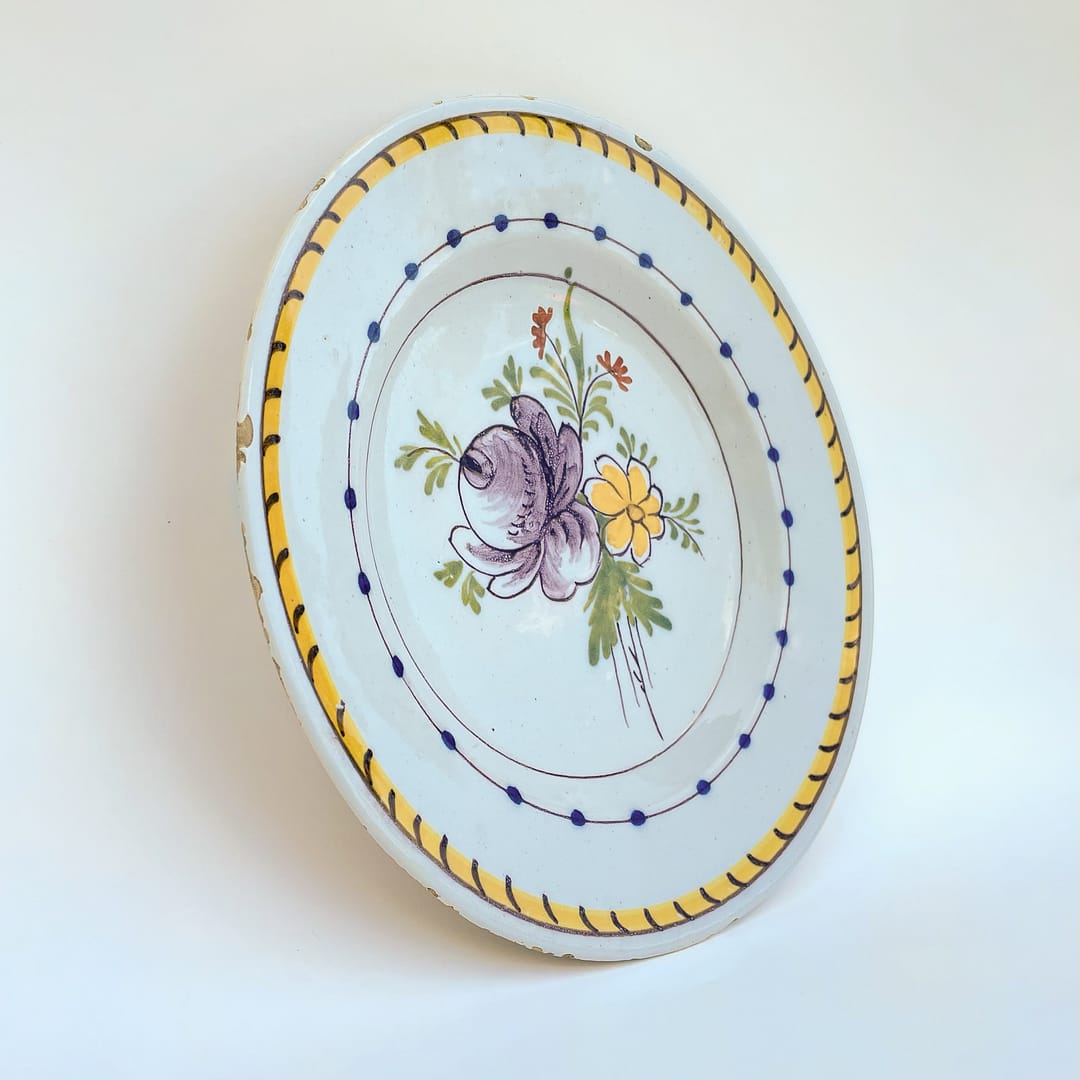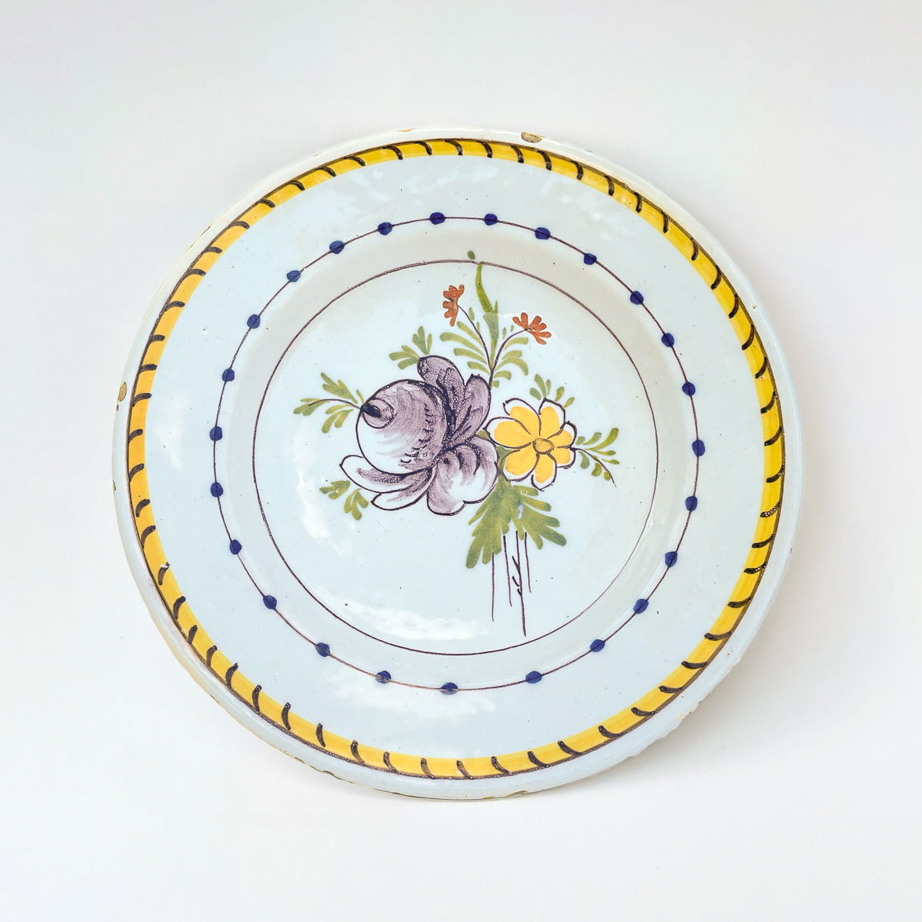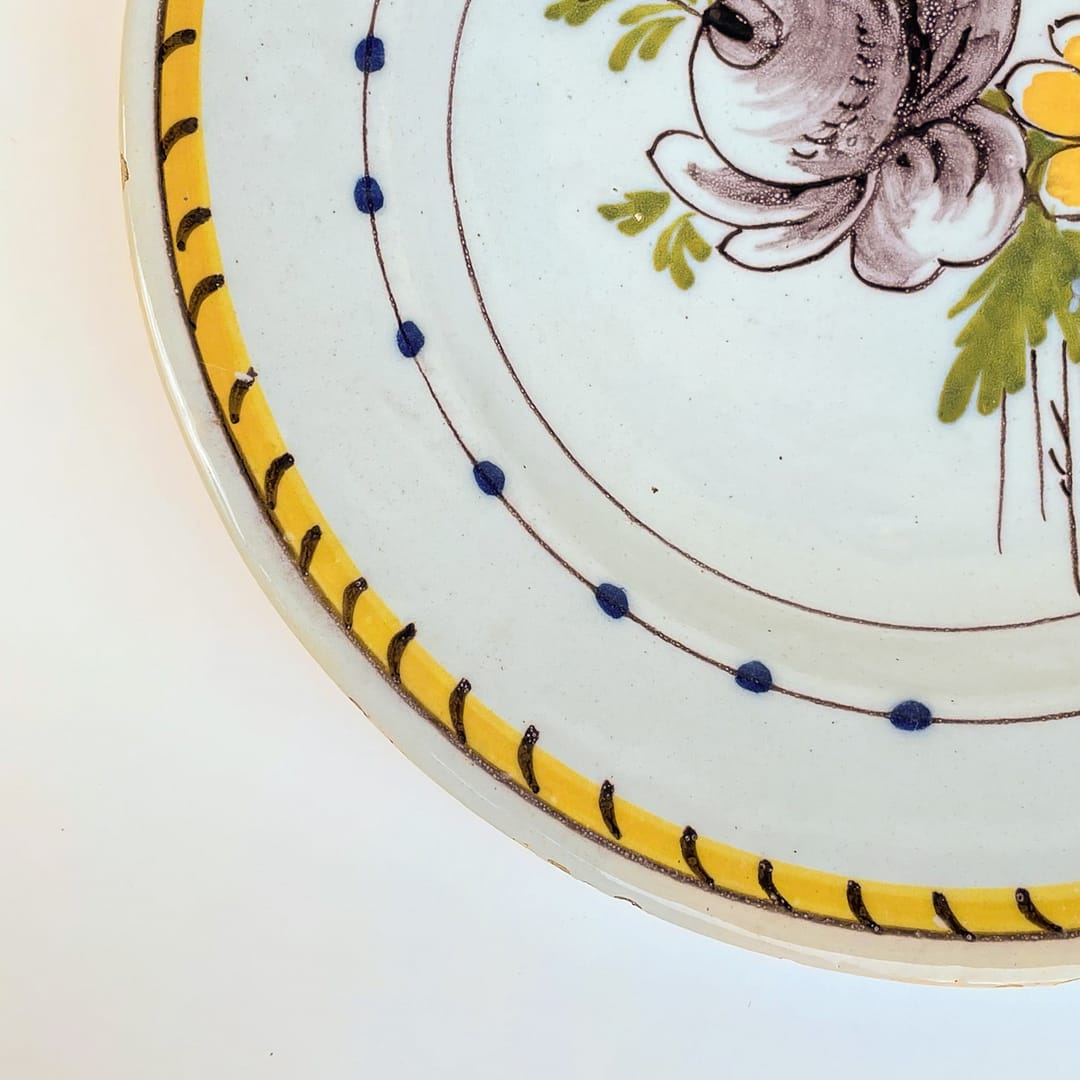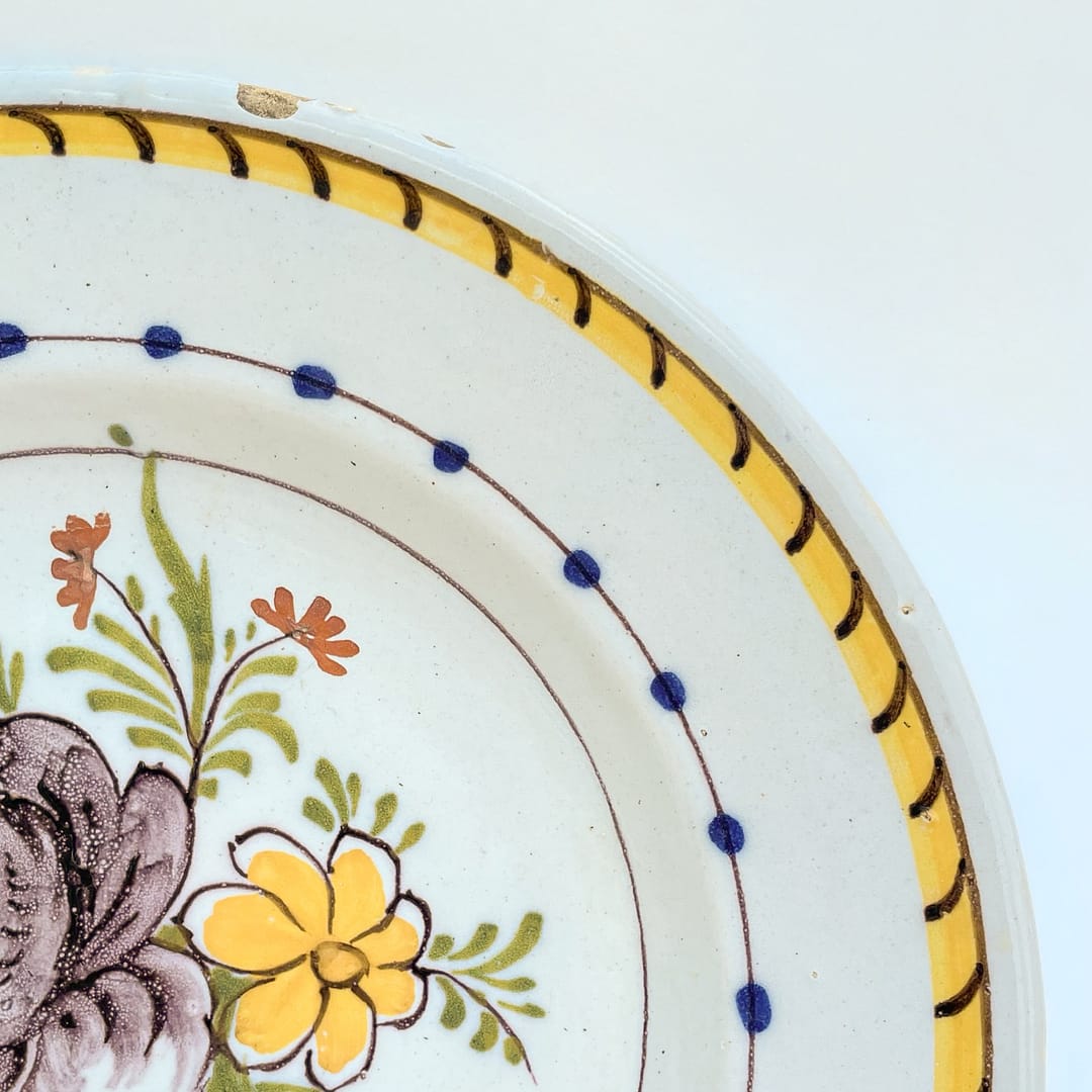 An antique late 18th-century Dutch Delft plate with polychrome floral motives. One of a set of three.