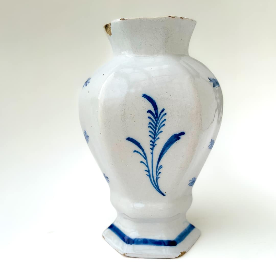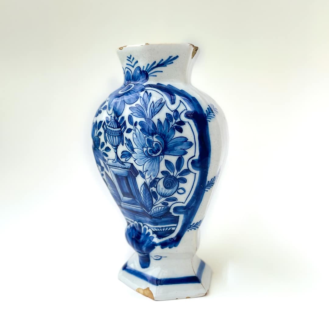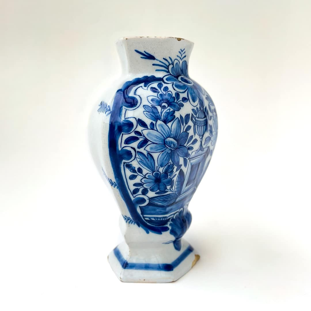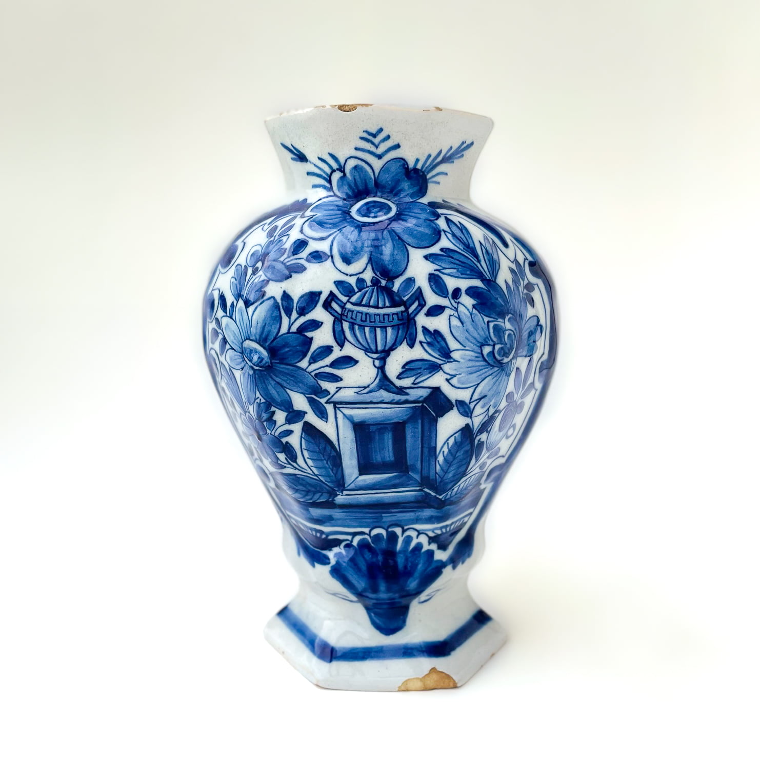 An antique Dutch Delft vase with blue and white floral motives, De Klaauw factory, circa 1780. One of a pair of two.