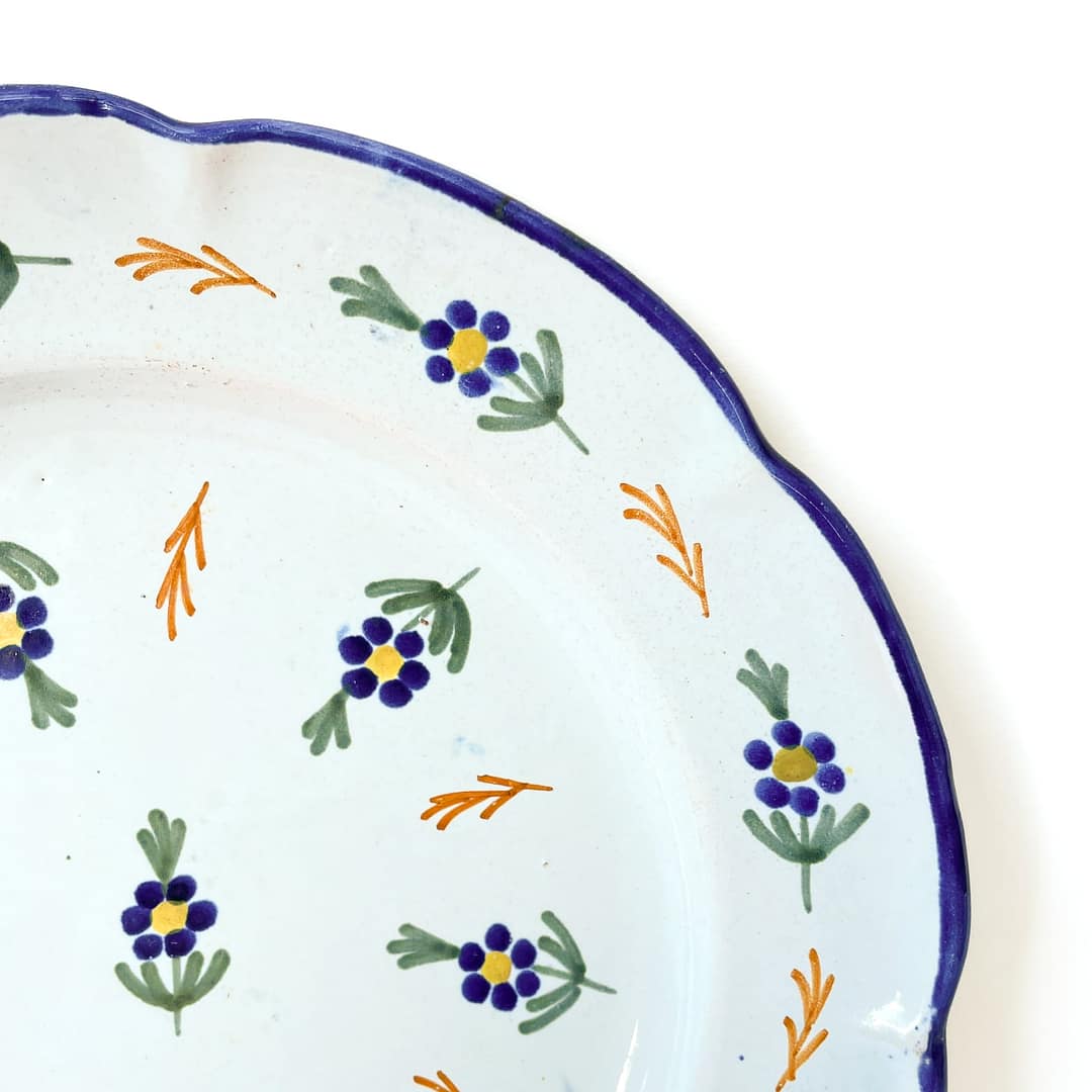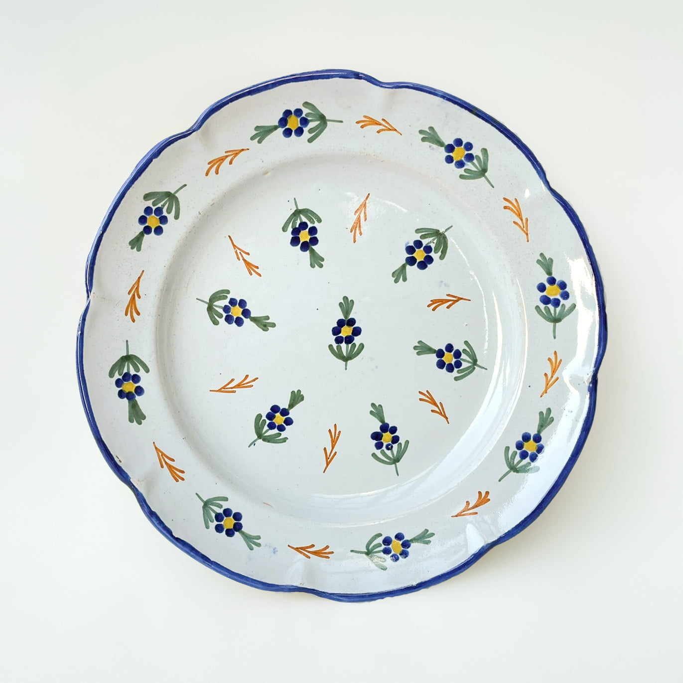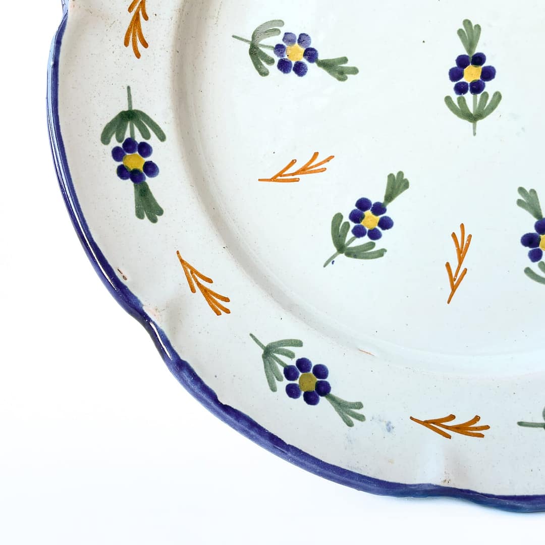 An antique late 19th century French faience plate decorated with a delicate polychrome floral motif. The edge is shaped and features a decorative blue rim. One of a pair of matching plates.