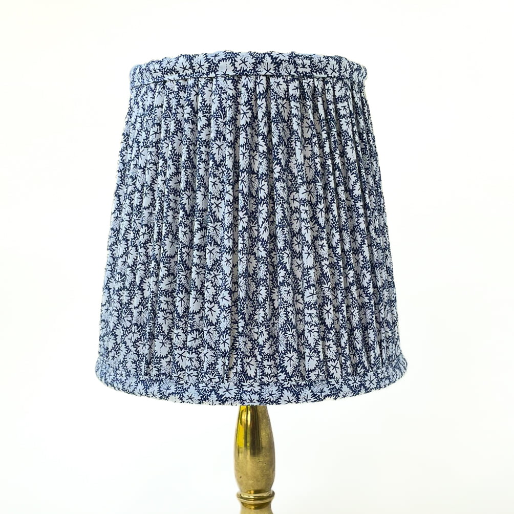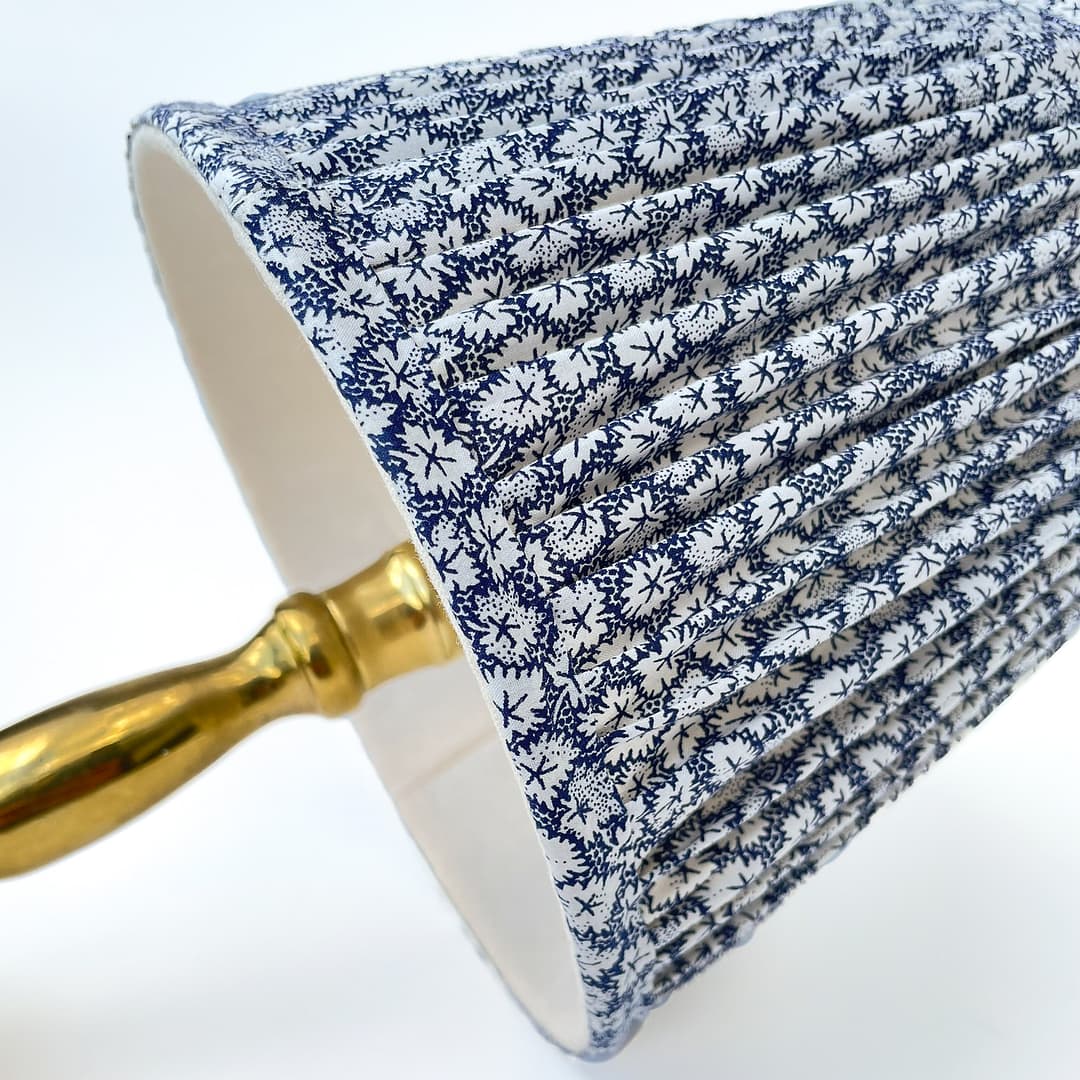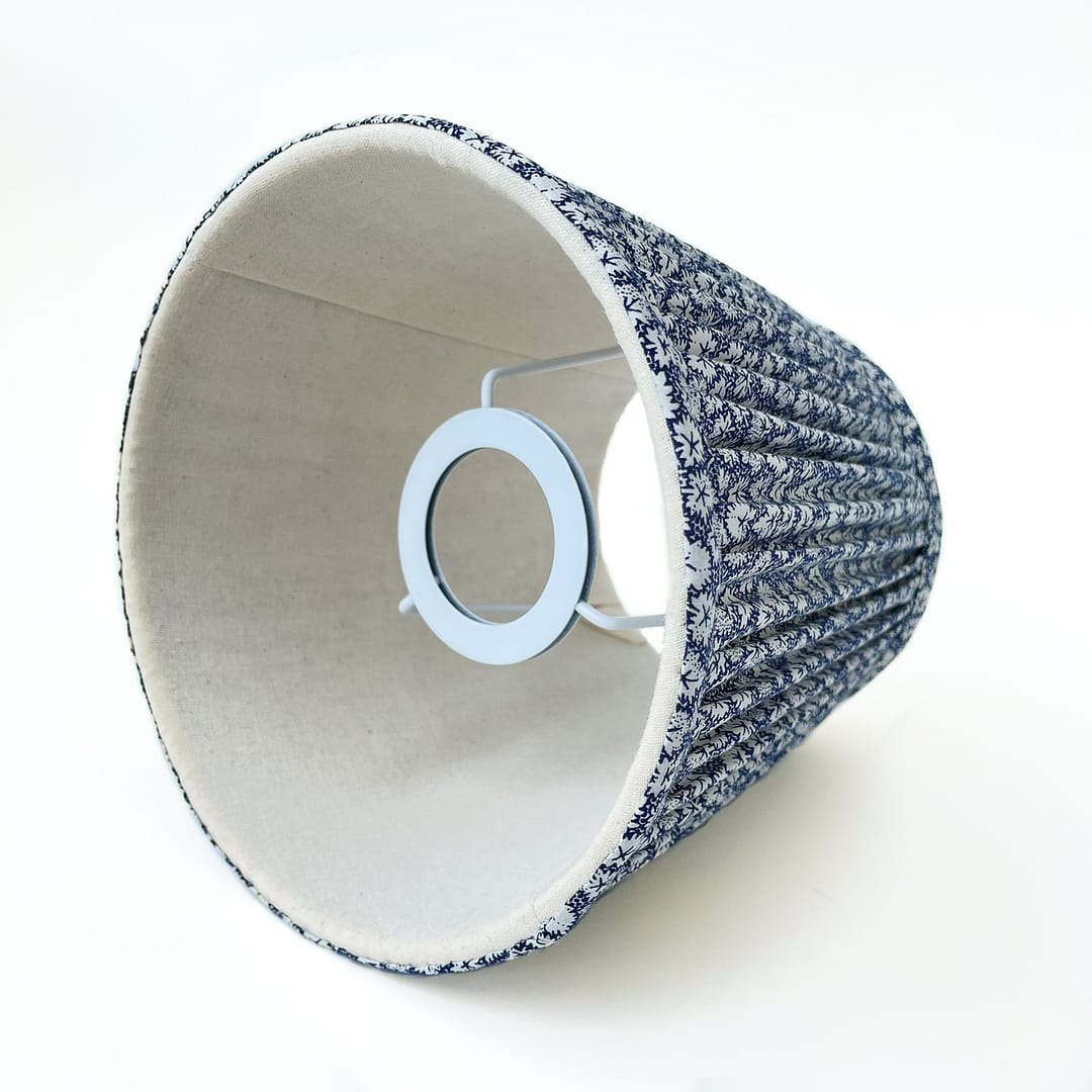 Hand-made gathered lampshade in light blue patterned fabric and cream light lining. 100 % cotton. Dimensions: base 17 cm, top 12 cm, slope 16 cm.